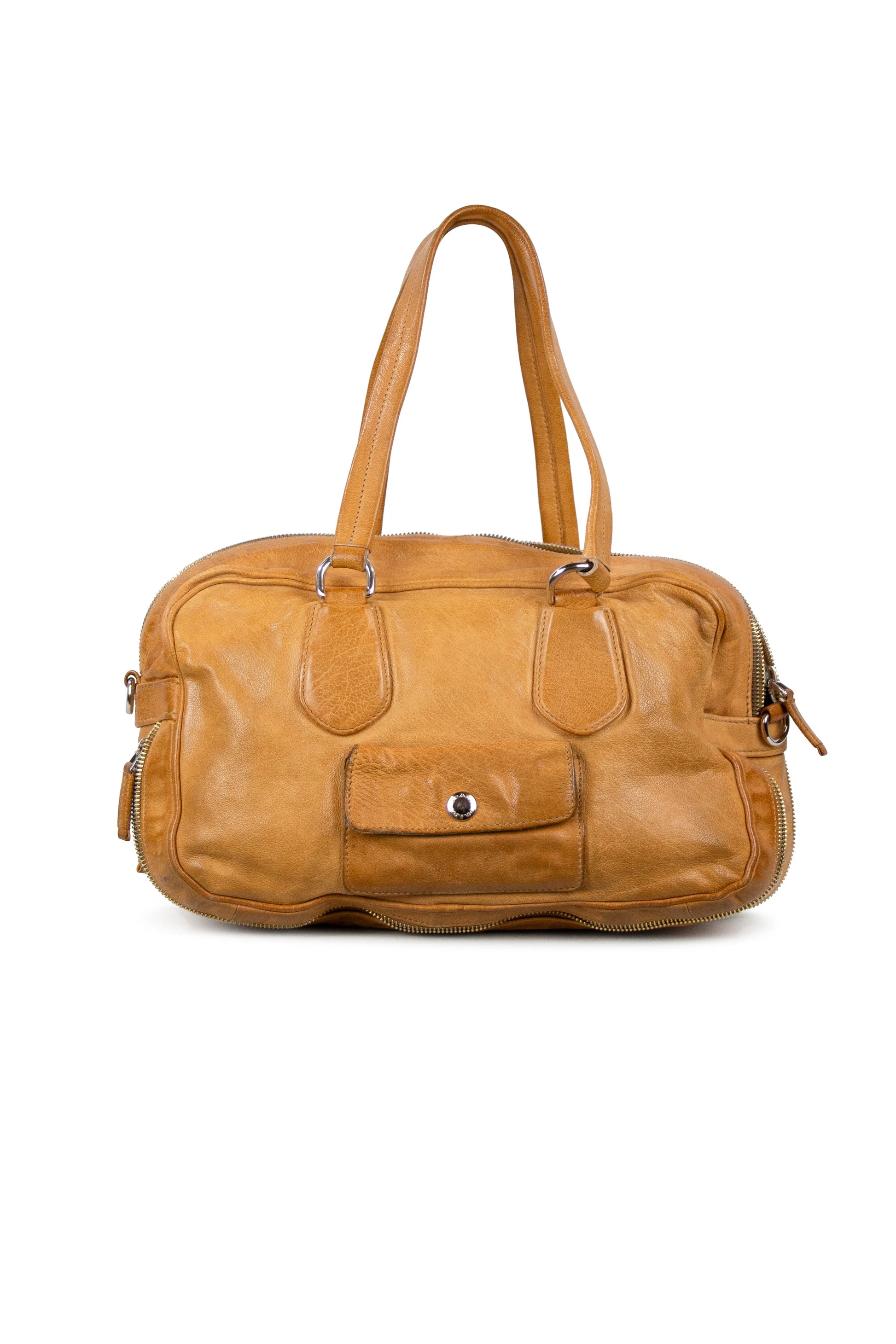 Questa intramontabile borsa bowling Prada della collezione 2005 unisce una sobria raffinatezza a un audace tocco interno. Realizzata in morbida pelle beige, la borsa presenta una classica forma bowling con linee pulite e una silhouette strutturata. L'esterno è decorato con il logo Prada in argento, che aggiunge un tocco di lusso raffinato. All'interno, l'interno in pelle arancione crea un sorprendente contrasto con l'esterno neutro, offrendo un dettaglio moderno e inaspettato.
