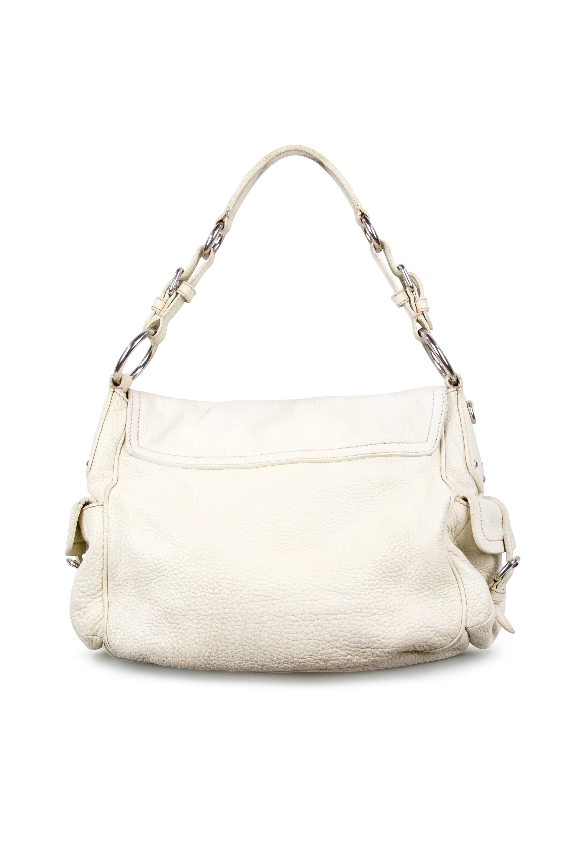 Questa elegante borsa hobo Prada in pelle testurizzata bianca fonde eleganza minimalista e dettagli pratici. Caratterizzata dalla classica forma hobo, la borsa presenta un manico singolo impreziosito da dettagli argentati per un tocco raffinato. La patta con il logo Prada aggiunge un lussuoso punto focale, mentre due tasche laterali in stile cargo ne esaltano la funzionalità e conferiscono al design un tocco moderno e funzionale.