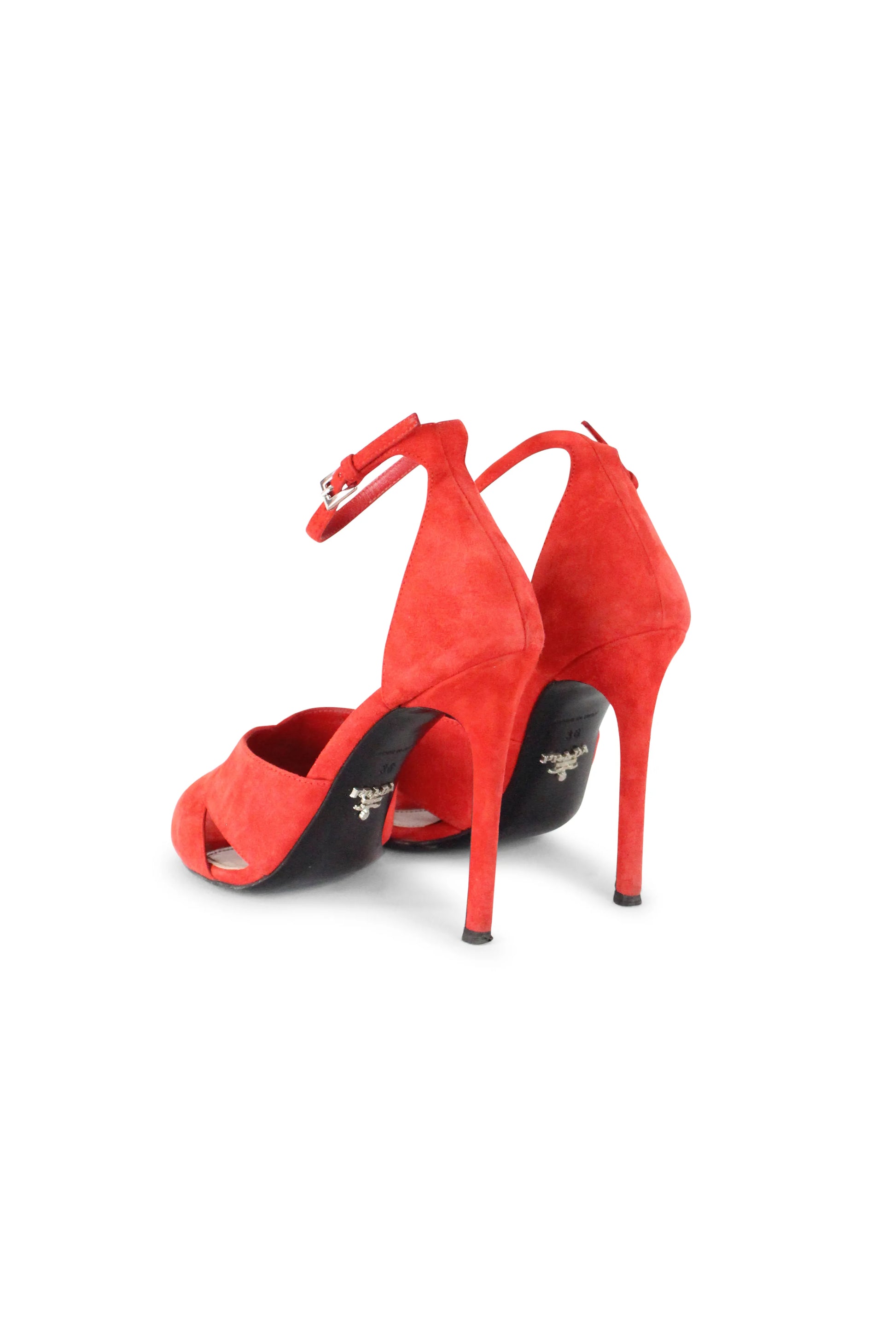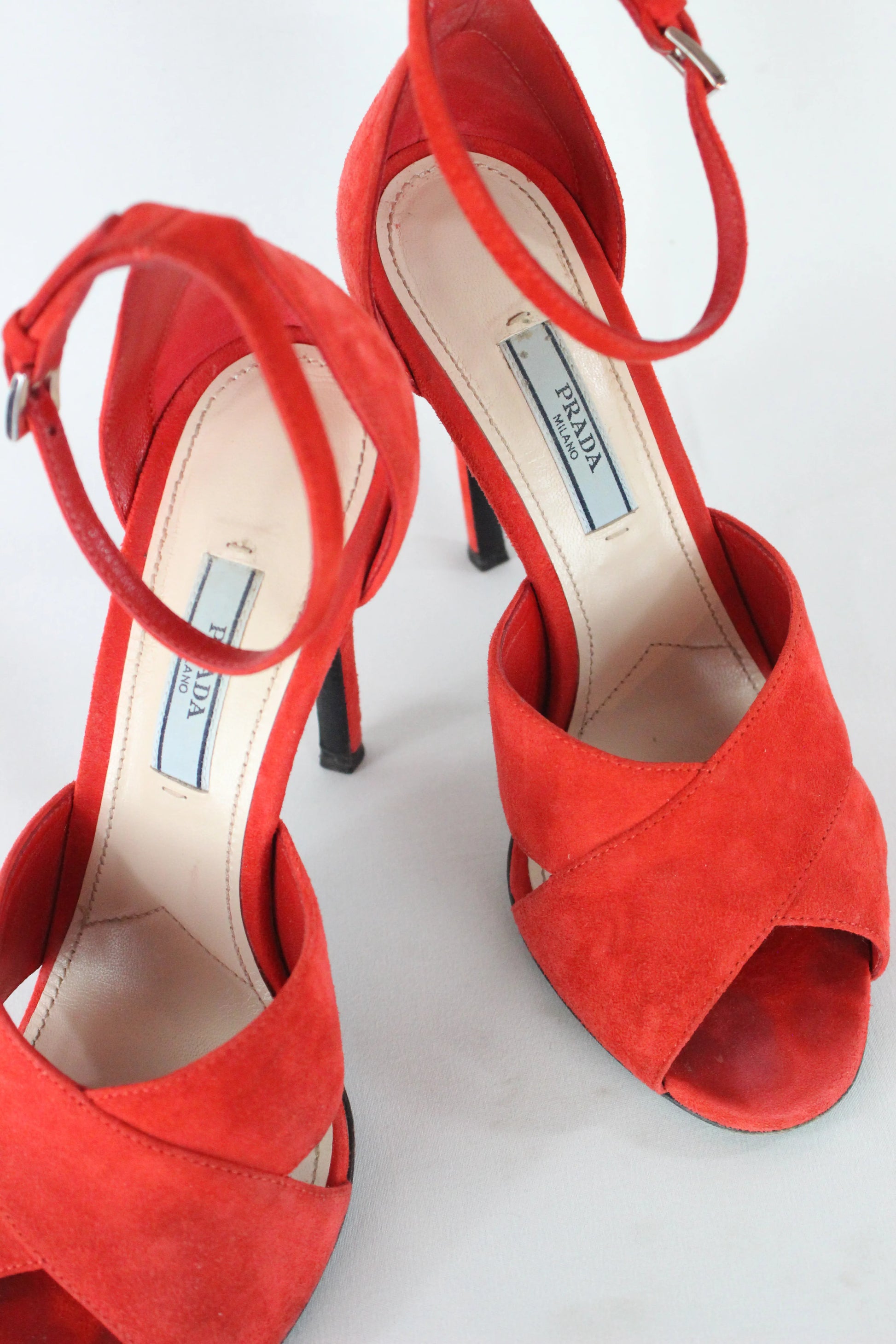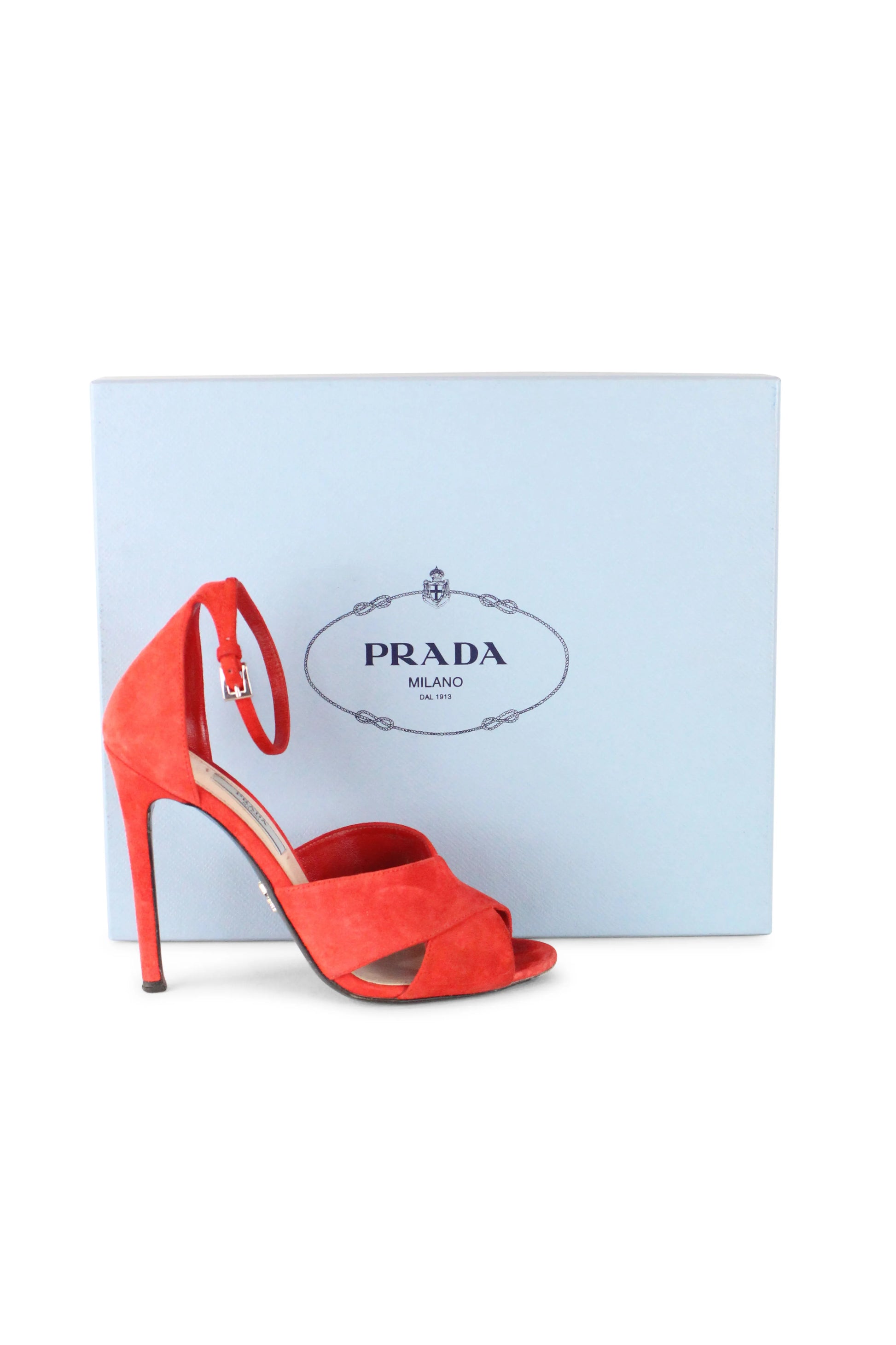 These elegant and vibrant Prada sandals are crafted in rich coral red suede, radiating confident femininity. The design features wide, overlapping bands that cross gracefully over the front of the foot, creating a sculptural and secure fit. Delicate ankle straps enhance the silhouette, while the slim stiletto heels add height and sensuality.